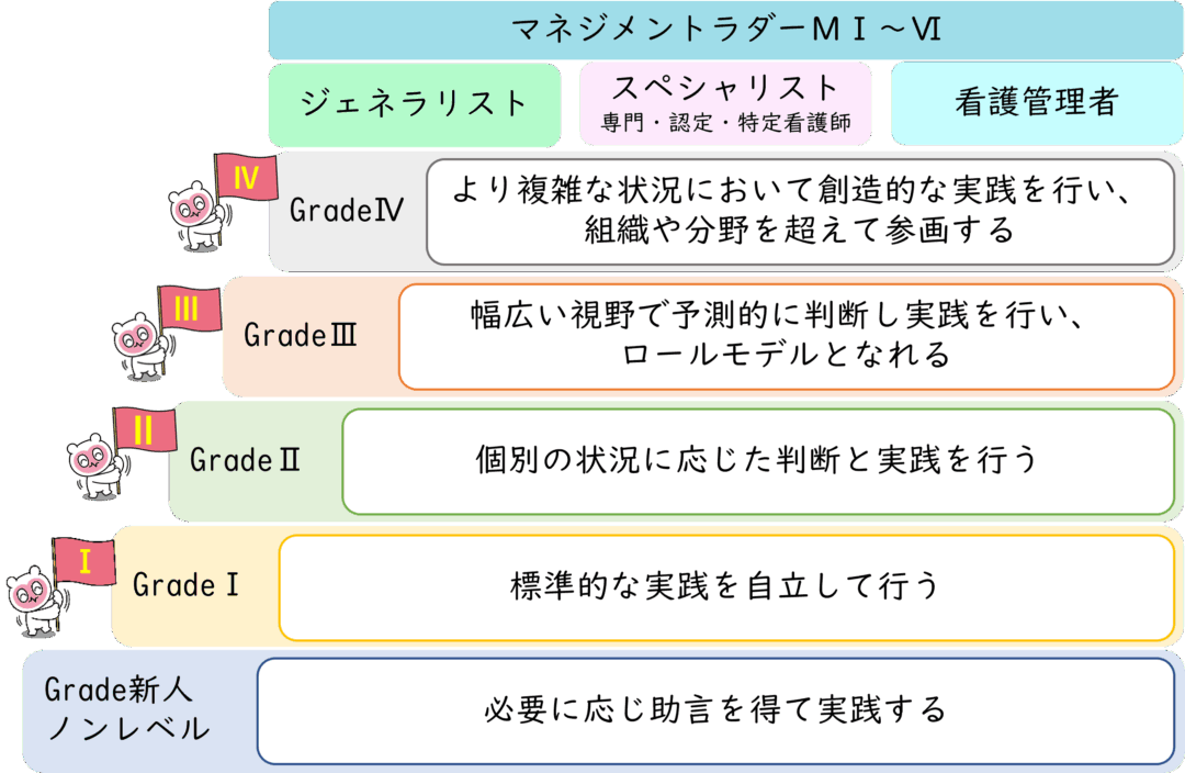 を目指すべき看護師の姿としました。 当院の看護師が備えるべき看護実践能力として、「専門的・倫理的・法的な実践能力」「臨床実践能力」「リーダーシップとマネジメント能力」「専門性の開発能力」の4つの領域で構成しました。