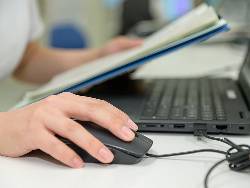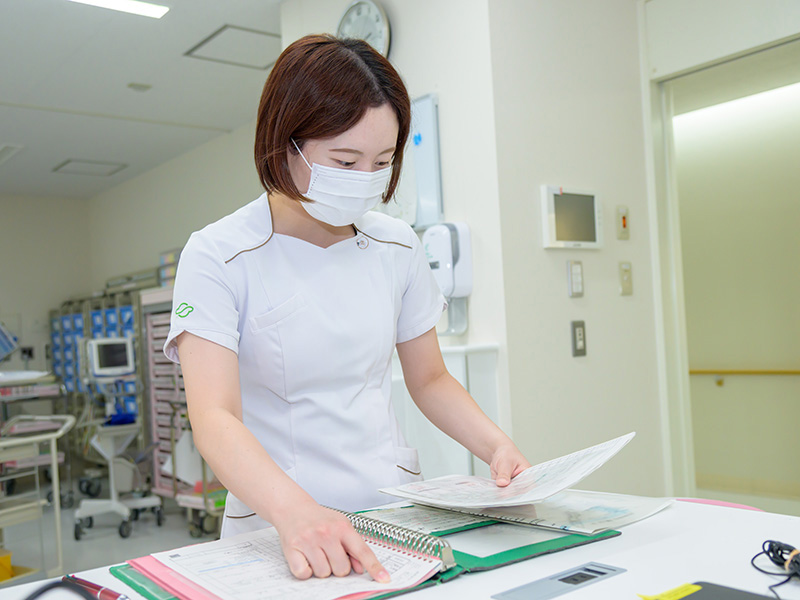 患者さんの状態や実施した看護を記録します。スタッフ全員が情報を共有し、24時間継続した看護が提供できるよう心がけています。