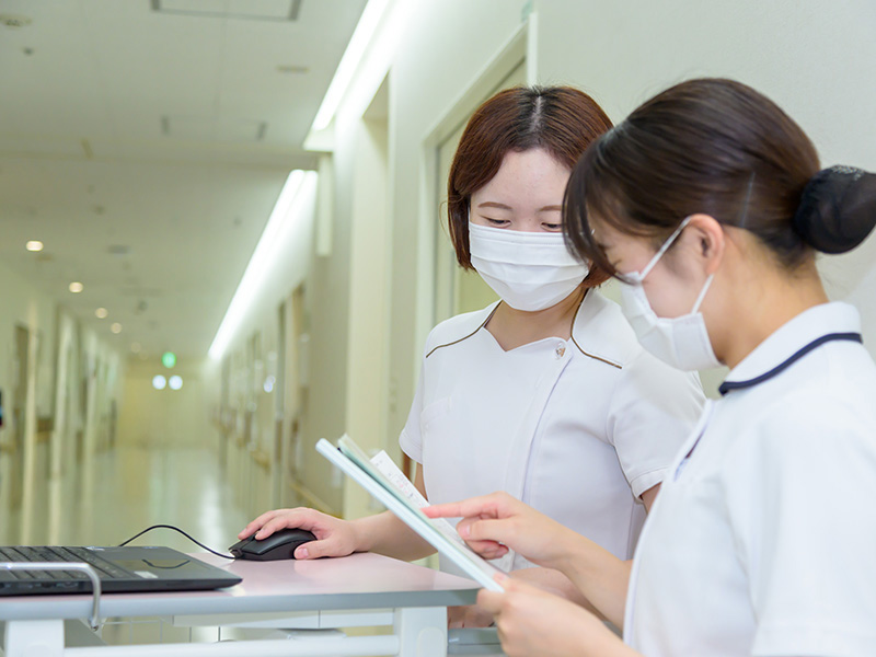 パートナーシップ・ナーシング・システムを導入し、ペア看護師と、こまめなコミュニケーションを大切に協力して業務を行います。患者さんの状態に合わせ、安全に丁寧に看護を行っています。