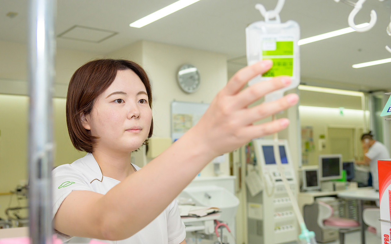 医師の指示に基づき、点滴を安全に投与できるよう準備します。取り扱いに注意が必要な薬剤や抗がん剤は、2名の看護師で慎重に確認を行います